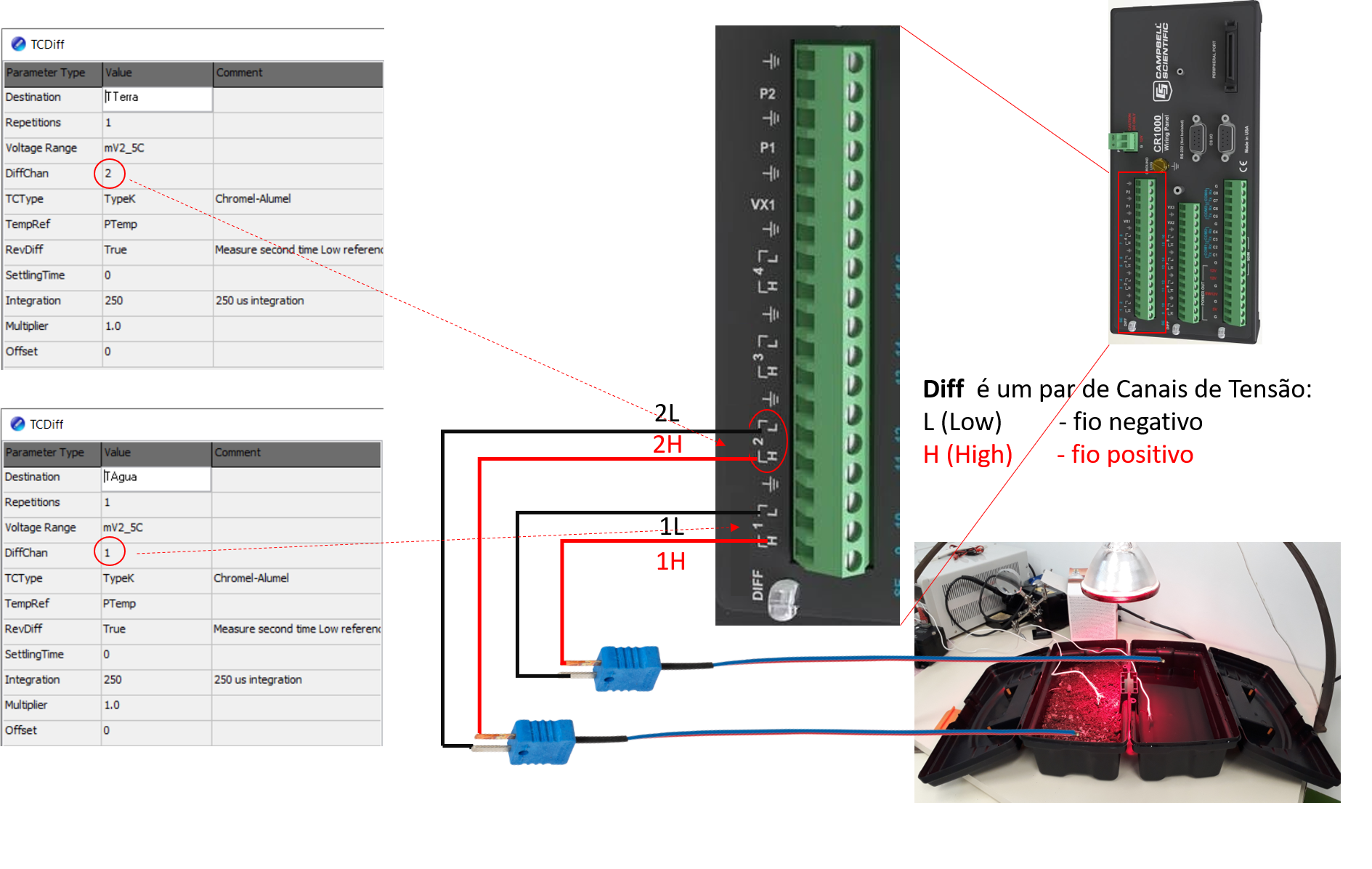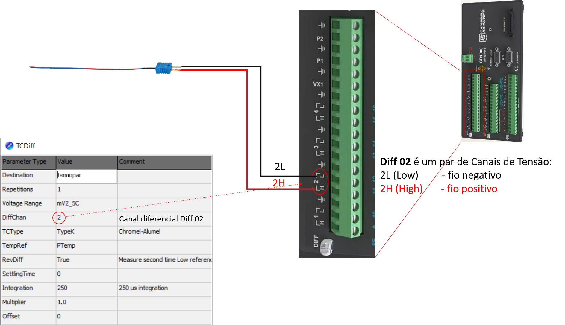 O termopar tem como sinal de saída uma tensão e não precisa de uma tensão de referência porque o termopar gera o próprio sinal de tensão. Isso se deve ao efeito SEEBECK que produz uma diferença de potencial (tensão elétrica) entre duas junções de condutores de materiais diferentes quando elas estão a diferentes temperaturas (força eletromotriz térmica). No entanto, esse sinal é muito pequeno e sua leitura de tensão deve ser ajustada para uma faixa (range) de 2,5 mV. A instrução TCDiff tem incluso o cálculo da curva de calibração do termopar conforme o tipo de termopar escolhido, e portanto, o Multiplier e Offset terão os valores sempre de 1 e 0 respectivamente.