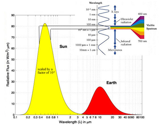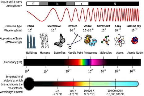 A radiação é entendida uma composição de ondas eletromagnéticas de diversos comprimentos de onda. Assim, tem-se o espectro eletromagnético com ondas longas como as ondas de radio e micro-ondas, passando por ondas intermediárias como infra-vermelho, visível e ultra-violeta; até as menores ondas como as ondas de raio-x e raio-gama.