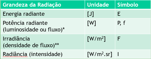 Além de seu espectro, é necessário entender a sua energia e que pode ser analisada pelas seguintes grandezas: Energia radiante (E), Potência radiante (P), {1:SA:=Irradiância} (F) e Radiância (I).