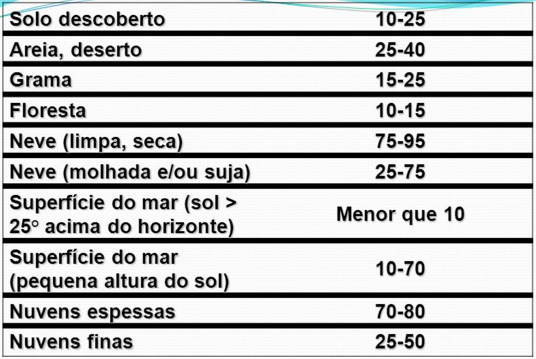O albedo médio da Terra é de 30% e pode varia de 95% para superfícies como a neve e gelo à superfície do oceano quando o Sol está 25° acima do horizonte.