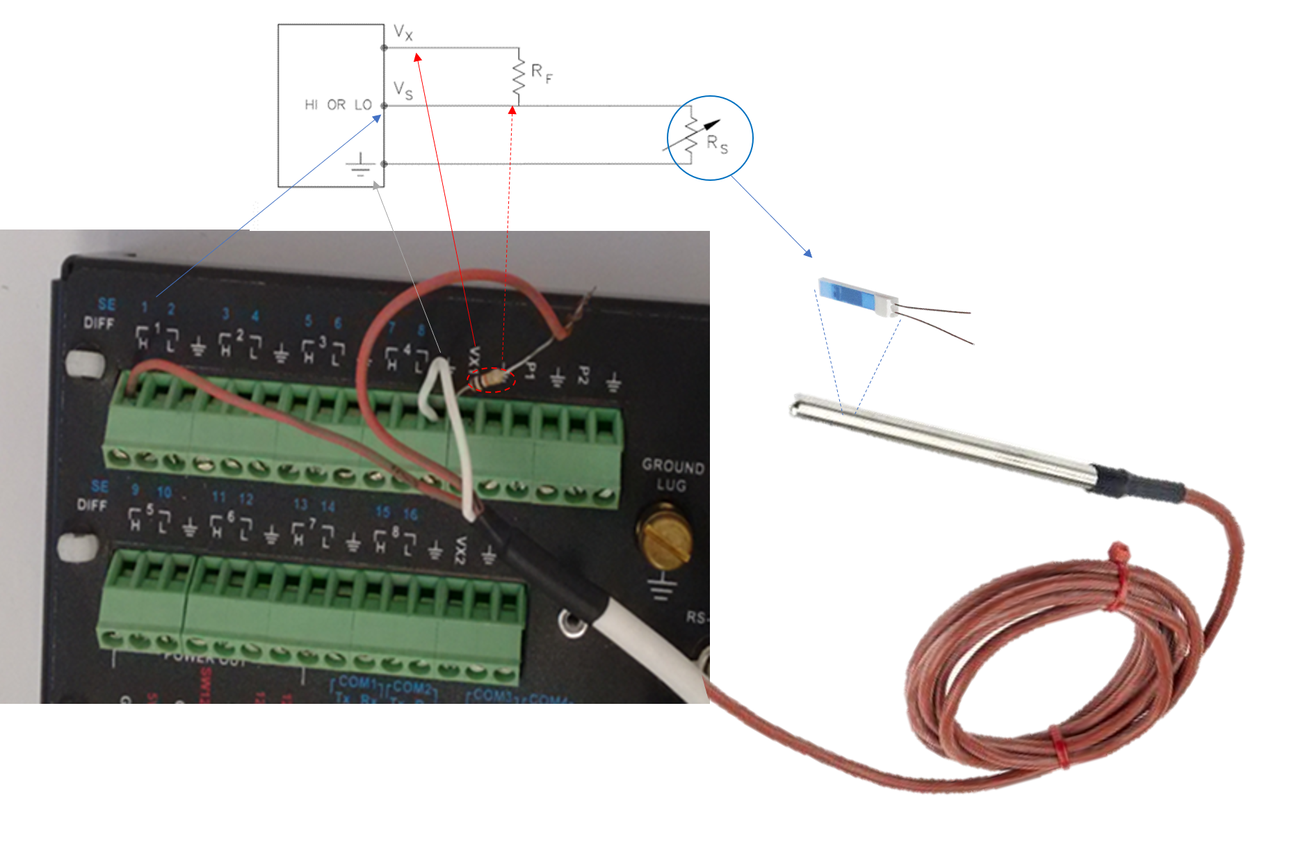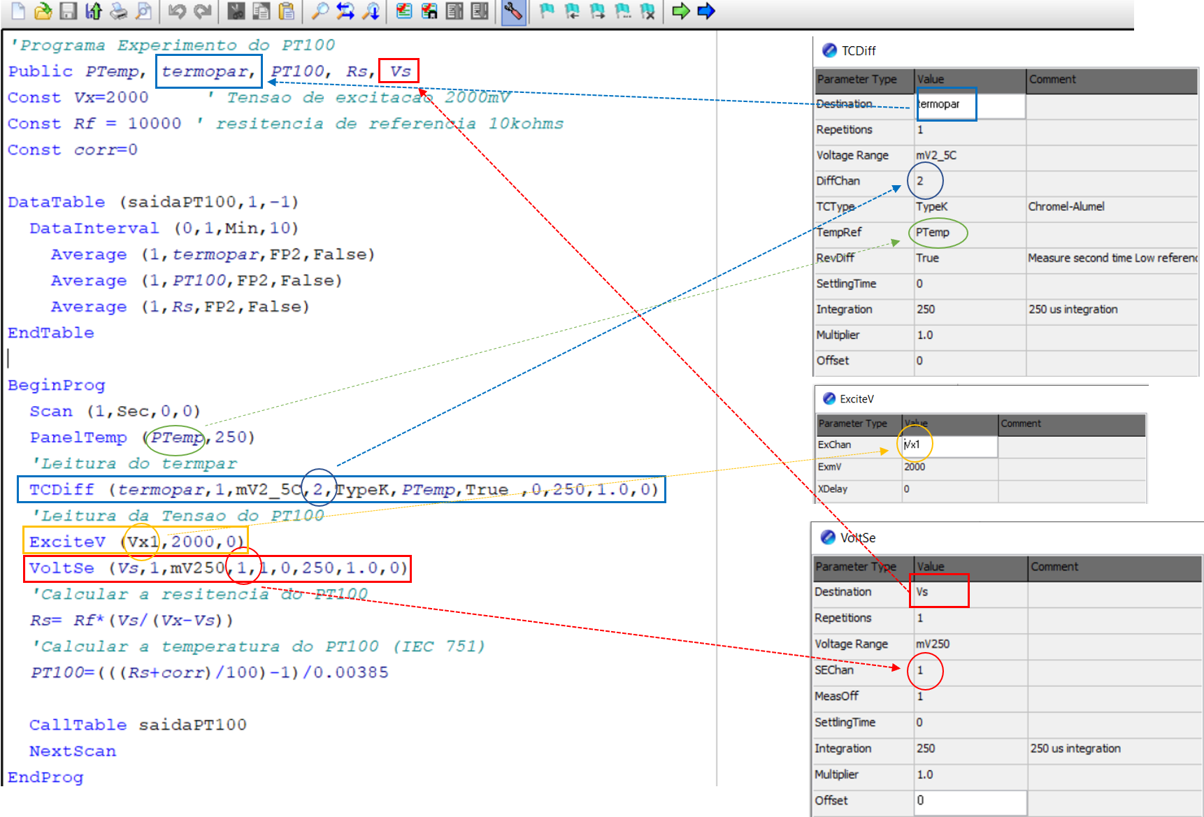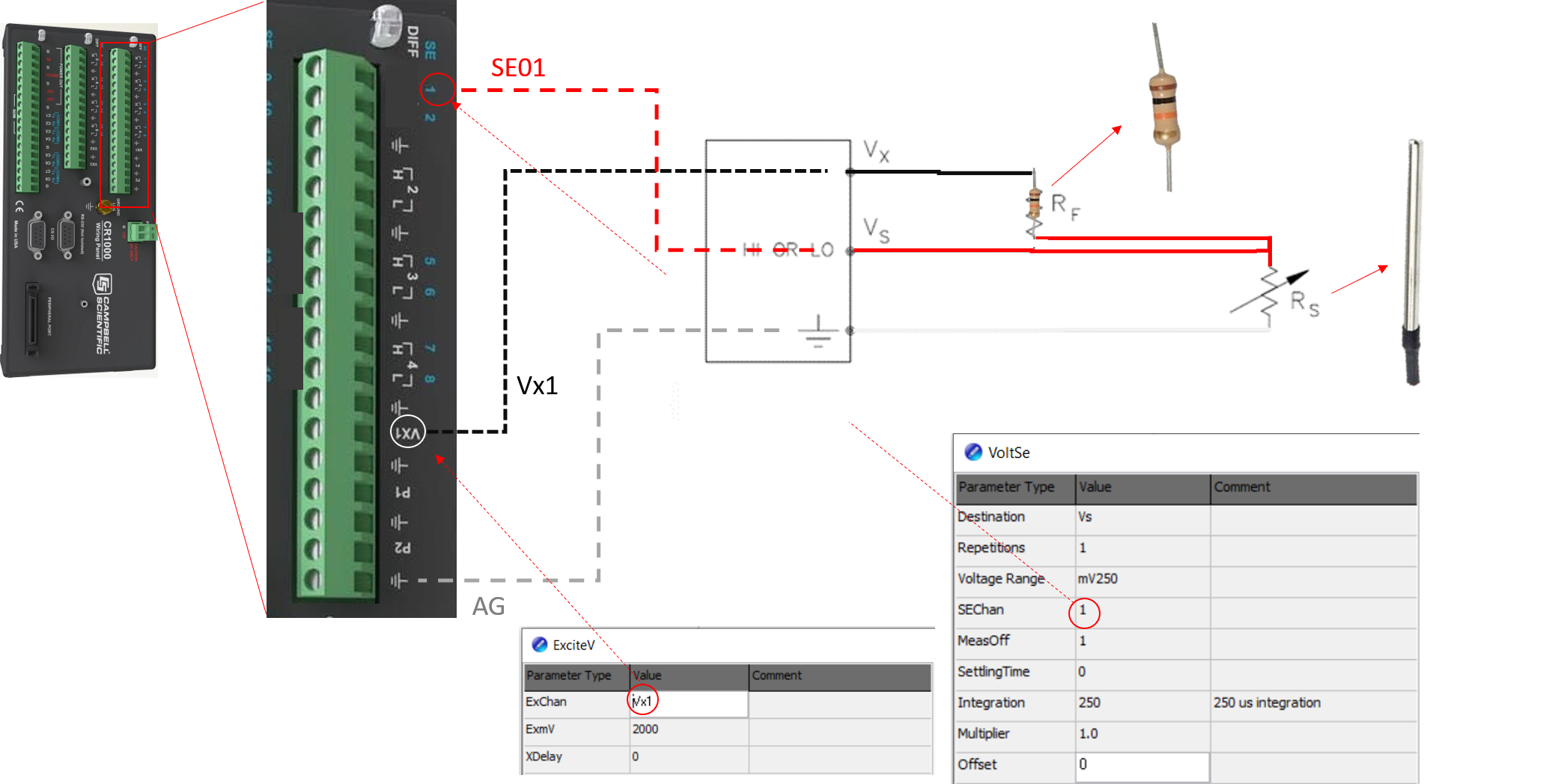 onde Rs é o valor da resistência do PT100, e pode ser determinada através de um circuito denominado de "meia-ponte". Abaixo tem um exemplo de um esquema deste circuito ligado no canal de tensão do datalogger (SE01) e no canal de excitação (Vx1)