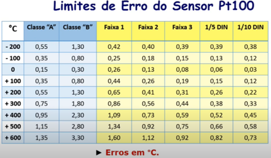 A norma IEC 751 descreve e classifica o PT100 conforme o valor da incerteza em cada faixa de medição conforme gráfico e tabela abaixo.