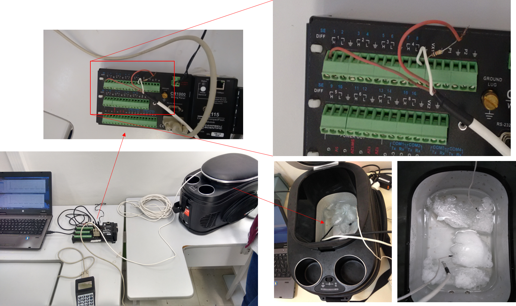 3) Calcule o erro sistemático do PT100. Ou seja, faça a diferença do valor médio da resistência (Rs) do PT100 à zero grau Celsius do valor de 100 ohms de referência. Inserir a correção da resistência no programa do datalogger (corr = 100-Rs).4) Configure o datalogger para que realize medições a cada 1 segundo de temperatura do termopar e do PT100, e armazene os seus respectivos valores de média e desvio padrão a cada 30 segundos no datalogger.
