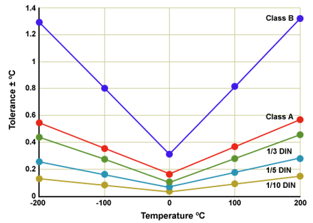 O PT100 de classe A tem uma incerteza 2x (duas vezes) menor que o PT100 de classe B. Do mesmo modo, os PT100 DIN 1/3, DIN 1/5 e DIN 1/10 tem uma incerteza 3, 5 e 10 vezes menor que o PT100 de classe B.
