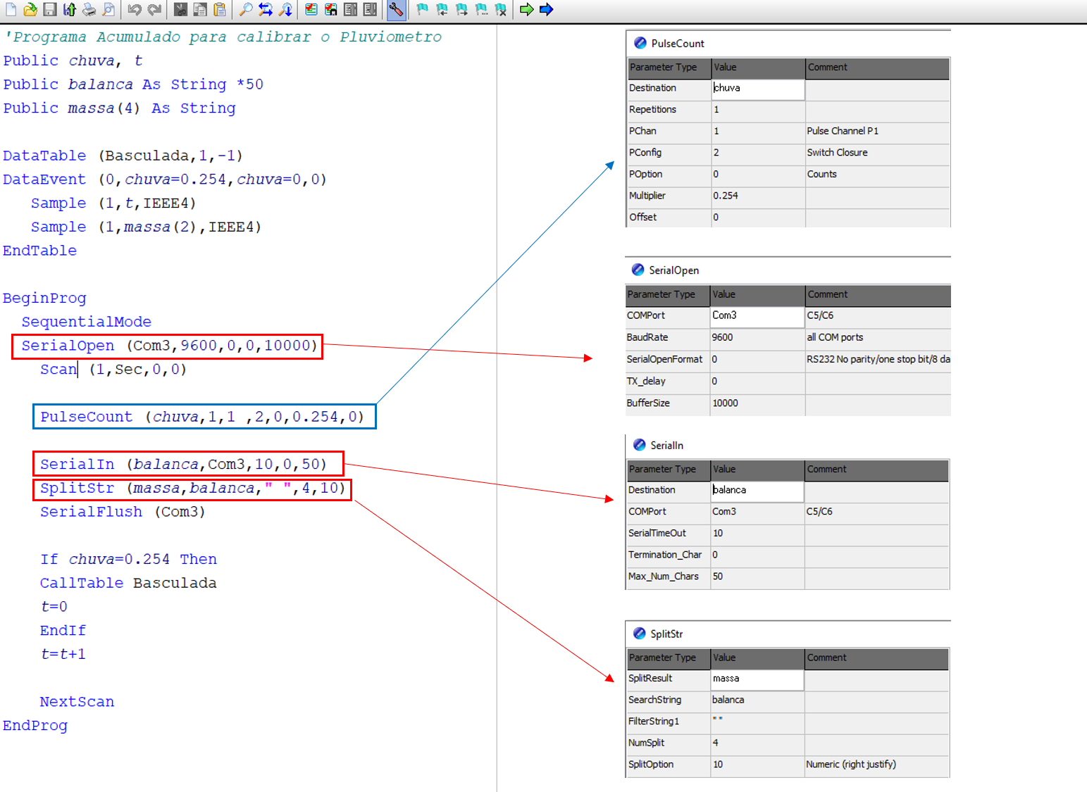 - Programação em CRBasic para leitura da Balança Digital e do Pluviômetro no datalogger CR1000.