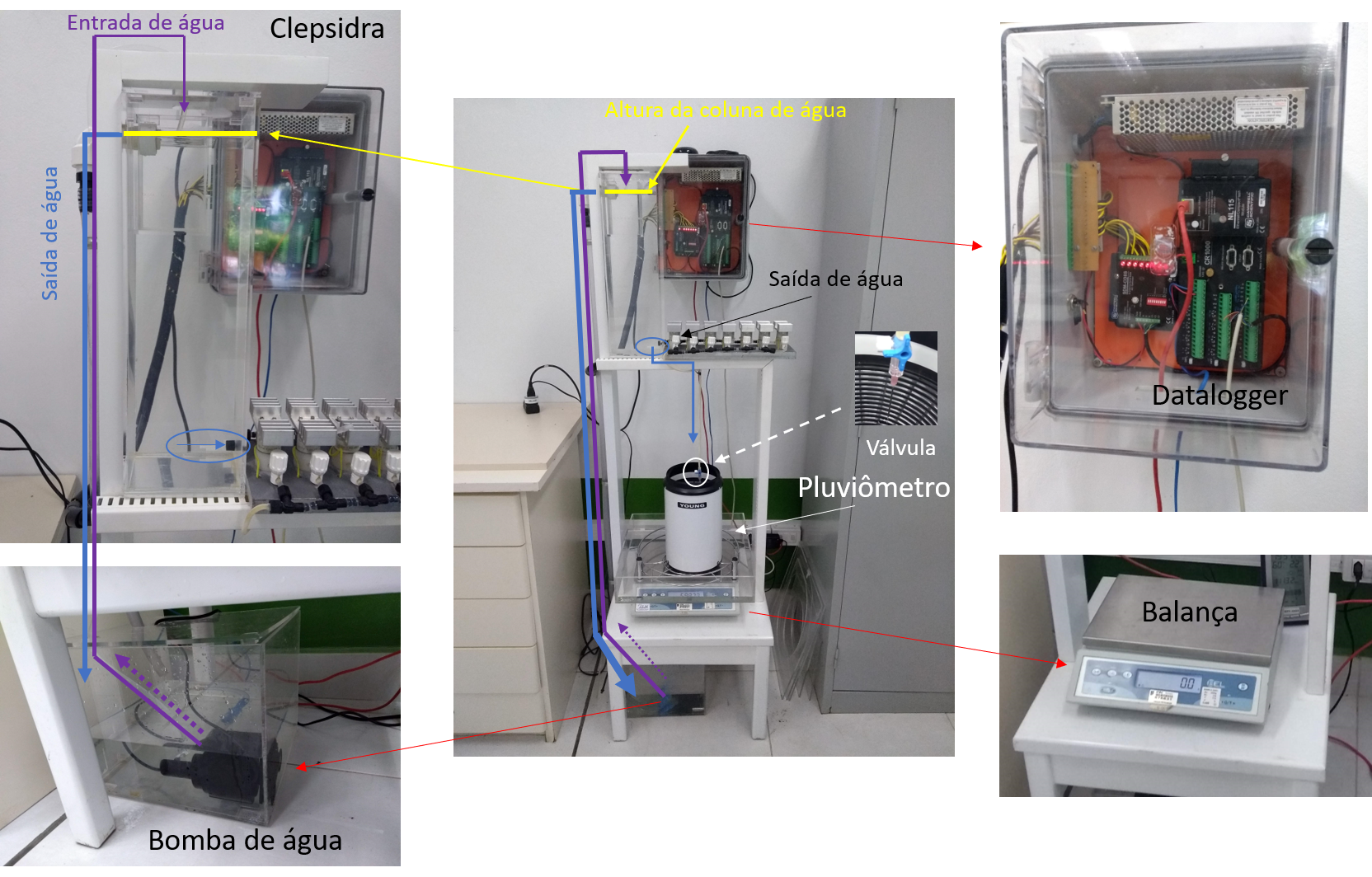 2) Com a válvula fechada, encher a clepsidra com água e mantenha a bomba de água ligada para manter a altura da coluna de água estável e constante. Pela equação da hidrostática, isso faz a vazão na saída inferior da coluna ter uma vazão constante;