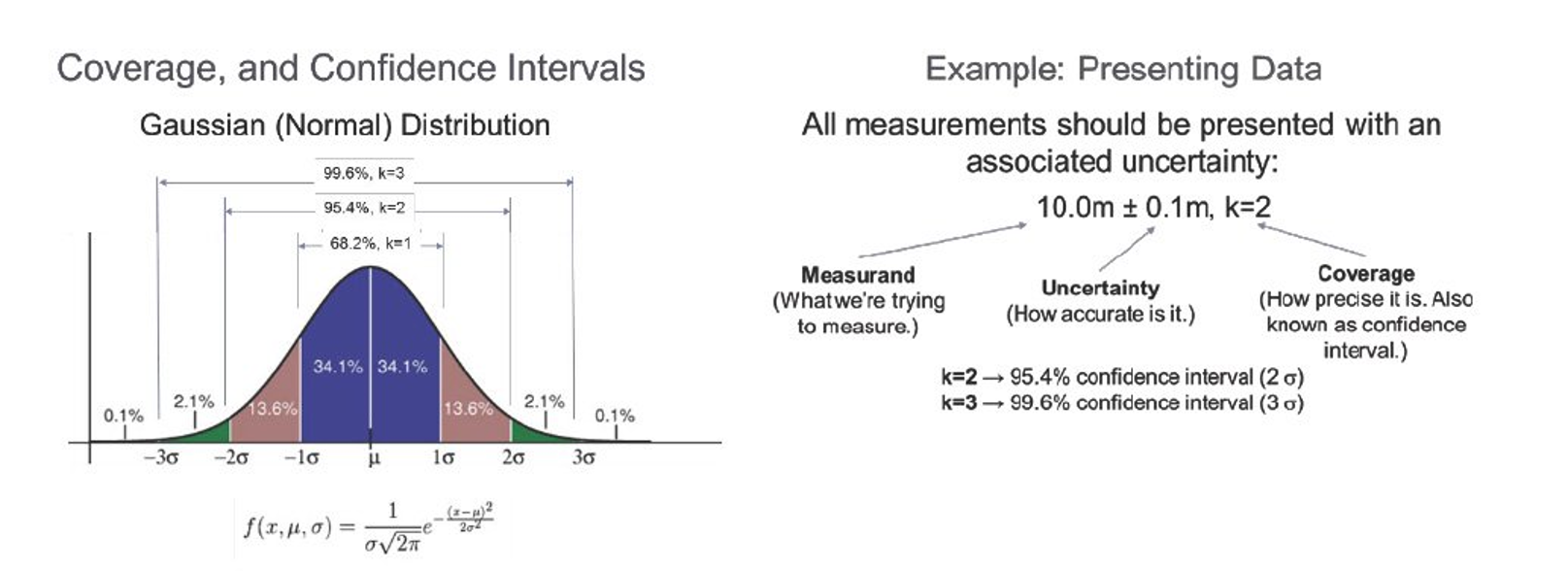 Este resultado de medição pode ser visualizado por um gráfico de distribuição de probabilidade. No caso de um grande número de amostras, tem-se uma distribuição gaussiana, onde o ponto de maior número de ocorrências (maior probabilidade) é o valor médio (μ) da distribuição (resultado base). O desvio padrão (σ) dessa distribuição é denominado de intervalo de confiança (incerteza de medição) que pode ser multiplicado por um fator (k), denominado de fator de abrangência, e que representa a probabilidade de o valor verdadeiro estar dentro deste intervalo.