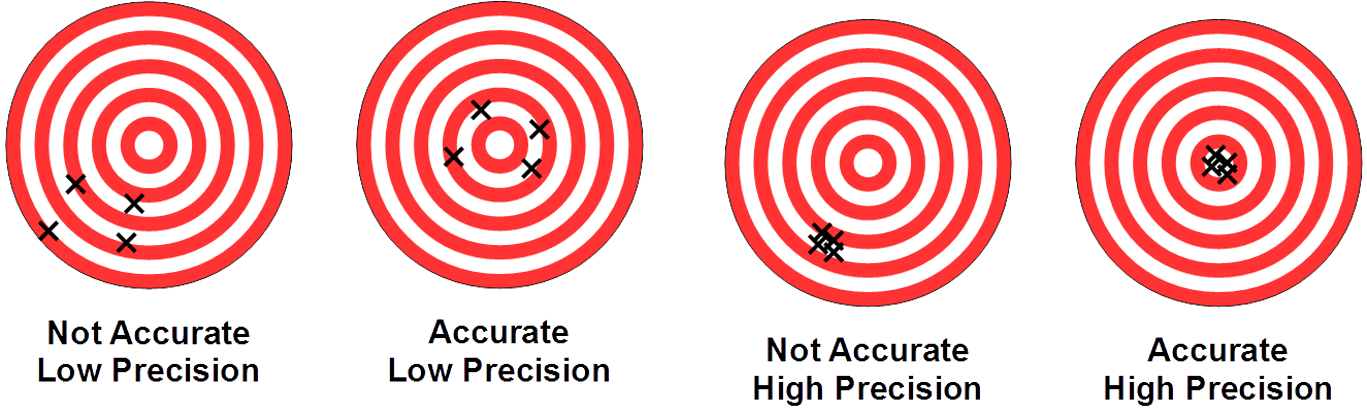 A incerteza de medição (IM), está associada ao erro aleatório, que é um termo quantitativo também, pois está relacionada com o desvio padrão das medições do instrumento. Quando não é possível obter um valor representativo do desvio padrão por causa de um número pequeno de amostras, mas nota-se que há uma dispersão entre os valores medidos, utiliza-se o termo "precisão" para expressar em termos qualitativos esse erro aleatório de medição. Abaixo, tem um exemplo de como descrever um instrumentos de medição em termos qualitativos utilizando os termos precisão (precision, em inglês) e exatidão (accuracy, em inglês).