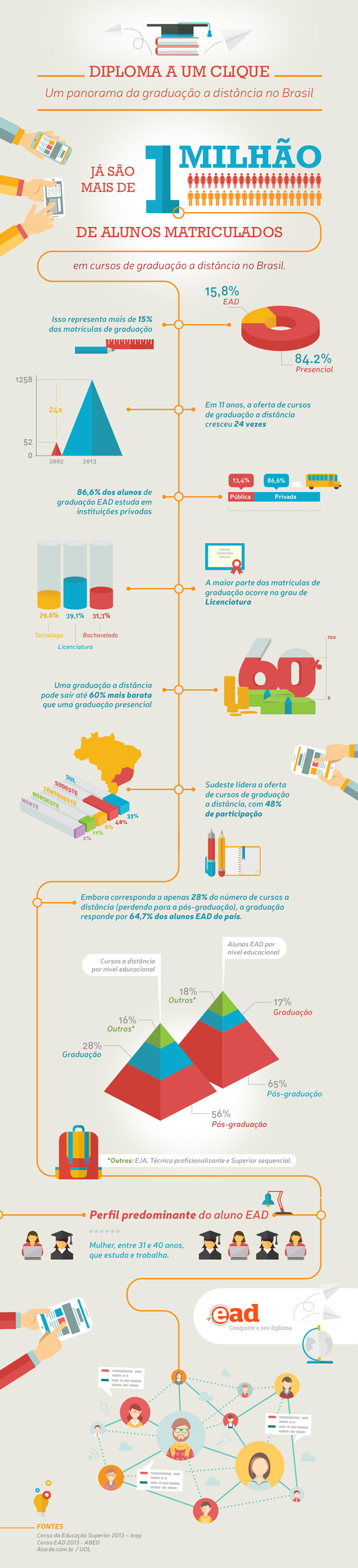 Percebe-se que a grande demanda para EaD está no perfil de estudantes adultos e profissionais que procuram melhorar sua qualificação de formação e cursos de complementação. Temos um panorama da modalidade apresentado pelo Site EaD Brasil em 2013 que permanece em 2017.