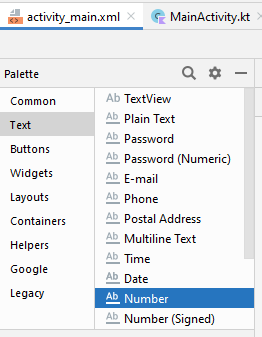 - Arraste um componente EditText do tipo Number como na imagem acima para a tela de design