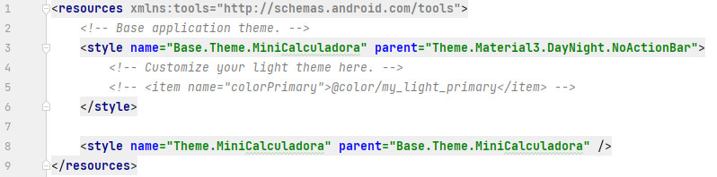 - O tema de um aplicativo se refere a toda uma construção visual da aplicação. O Android oferece uma série de temas pré-definidos de acordo com o Material Design. Neste projeto vamos usar o tema chamado DayNight. Esse tipo de tema faz um contraste entre uma versão claro e outra escura.