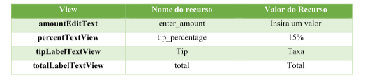 - SeekBar é uma barra deslizante para representar um valor inteiro entre 0 a 100 (por padrão). O usuário pode interagir com a barra e aumentar ou diminuir seu valor. Neste projeto, vamos usar a SeekBar para representar o valor da taxa de serviço e limitá-la para aceitar valores entre 0 e 30.