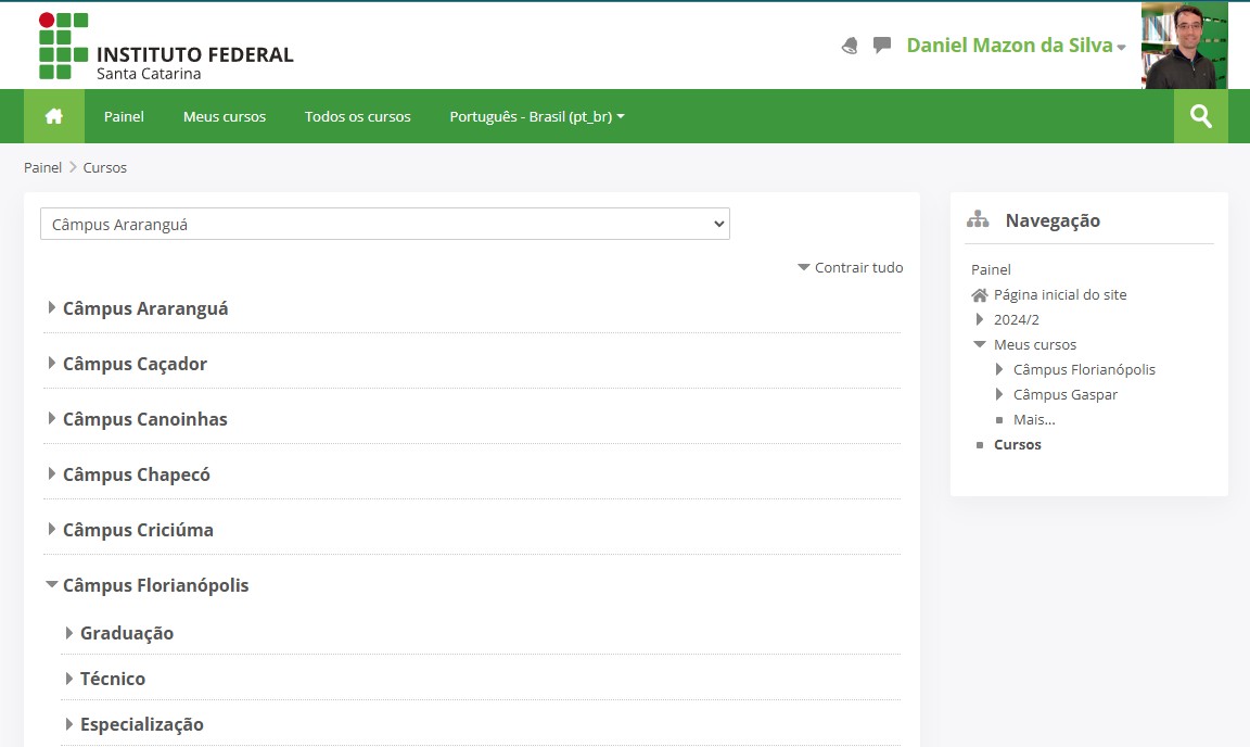 As categorias no Moodle permitem que administradores, gerentes e professores organizem as salas de forma lógica. Por exemplo, no Moodle IFSC, a organização de categorias segue um padrão em que, no primeiro nível, as categorias são divididas por campus e, em seguida, por níveis educacionais. Em cada categoria de campus, é designado um "Gerente de categoria" responsável por organizar e definir as categorias de acordo com as necessidades específicas de cada campus. Para acessar essas categorias, basta clicar na opção "Todos os cursos" na barra principal do Moodle.