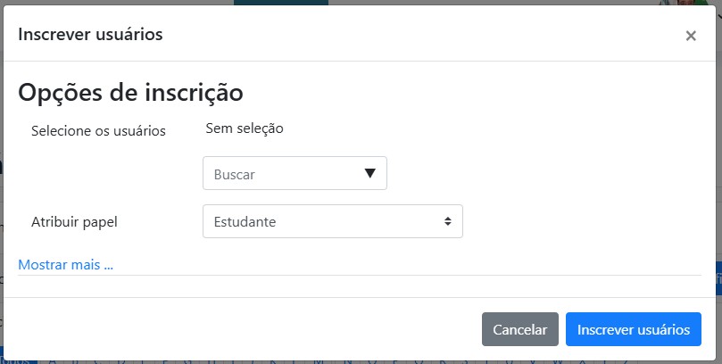 No entanto, pode ser necessário adicionar outros alunos ou até mesmo uma equipe técnica, como tutores e outros docentes. Para isso, é possível inscrever usuários manualmente por meio da opção 'Inscrever usuários'.