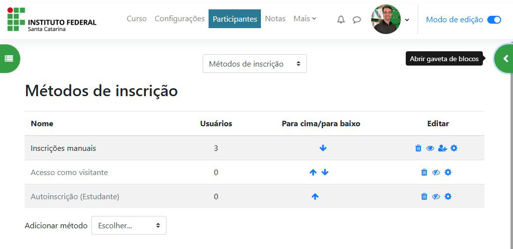 No Moodle, os métodos de inscrição são as formas pelas quais os usuários podem ser matriculados em um curso. Como já mencionado, no IFSC é utilizado o método de inscrição automático via integração do Sigaa com o Moodle, mas existem vários métodos, e o administrador ou professor do curso pode escolher quais ativar.