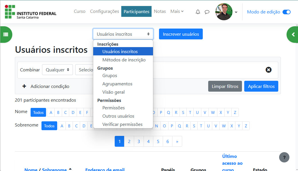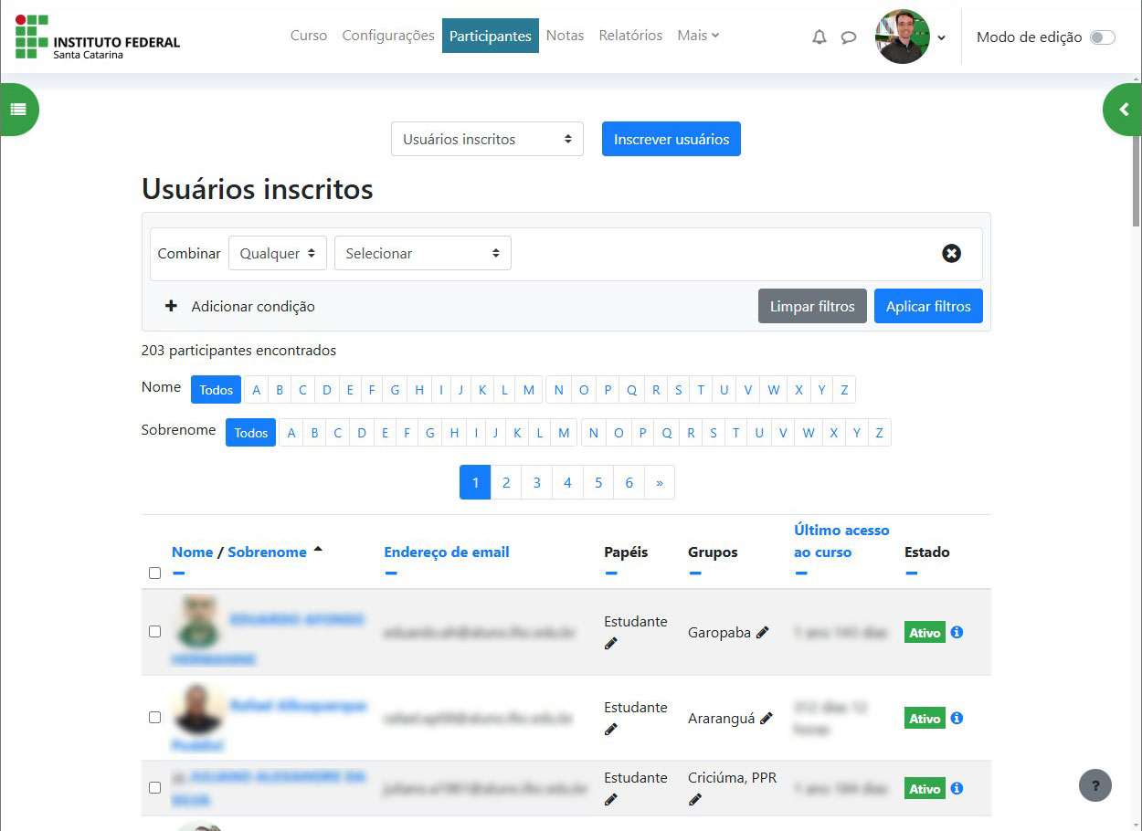 No IFSC, utilizamos uma integração entre o SIGAA e o Moodle para que as inscrições dos alunos sejam feitas automaticamente, conforme as matrículas realizadas pelas equipes de Registro Acadêmico de cada unidade.