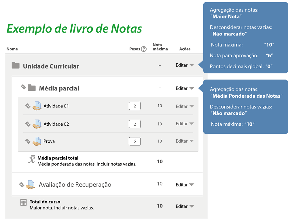 Avaliações podem ser agregadas para formar a nota final que será registrada no livro de notas.