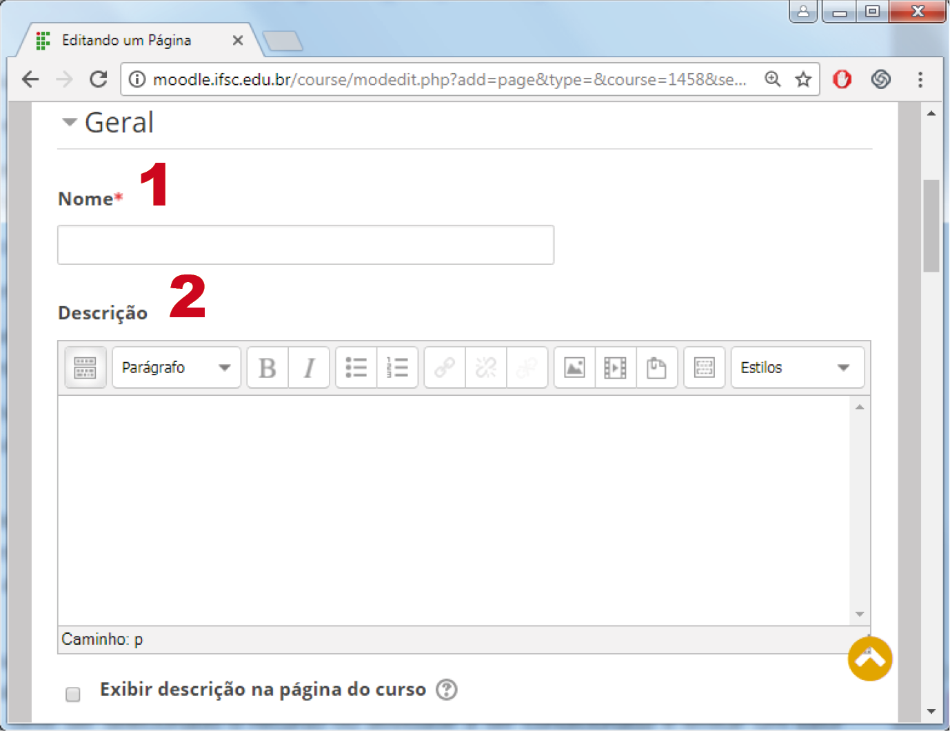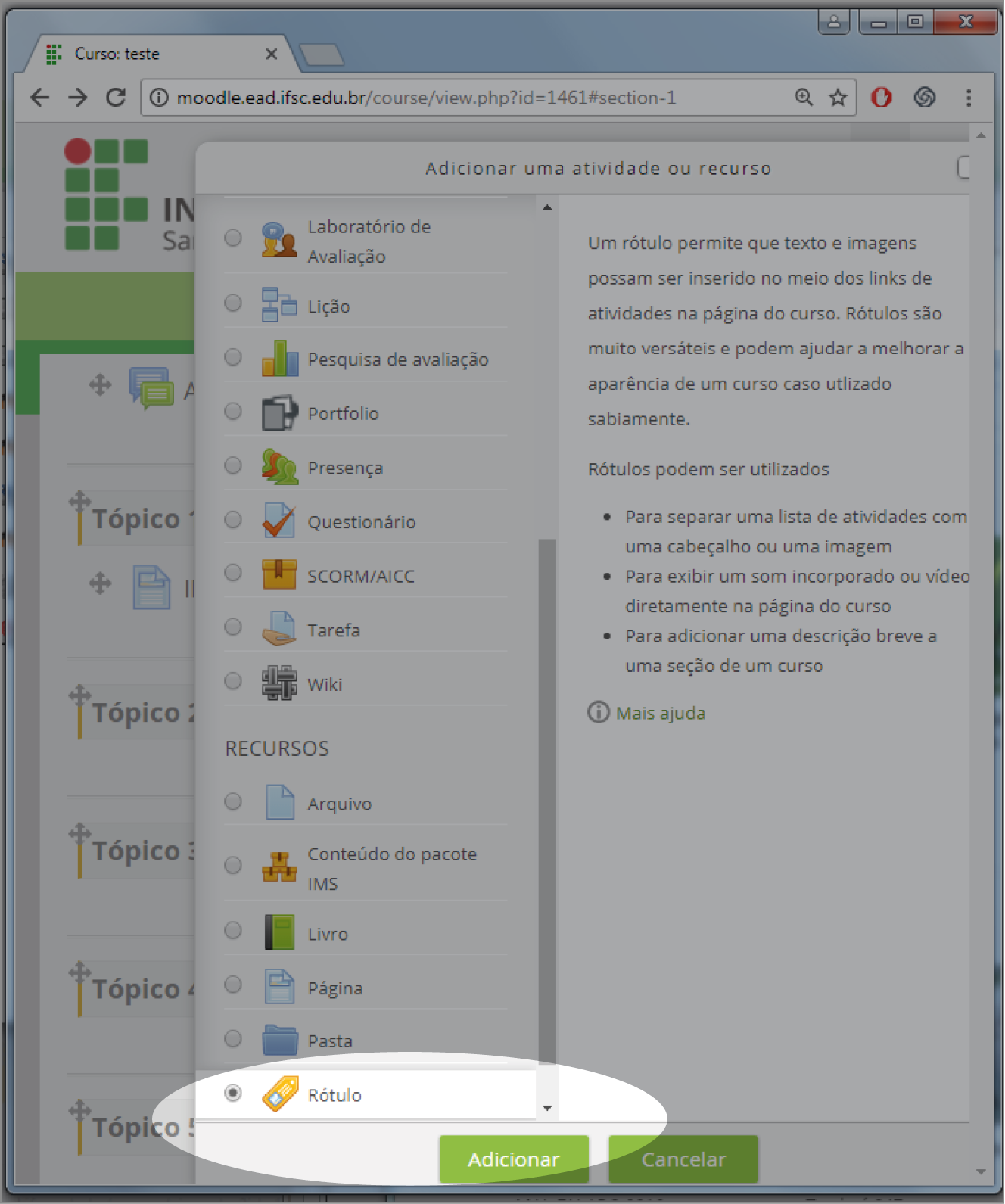 É um recurso versátil permite a integração de textos, imagens e vídeos, contribuindo para a formatação da página da sala virtual. Por meio desse recurso, é possível organizar de maneira mais eficiente os materiais disponíveis em cada tópico da sala. Por exemplo, no IFSC, utilizamos essa funcionalidade para distinguir entre os recursos e atividades obrigatórias e as opcionais em cada unidade de estudo, aprimorando assim a apresentação e a acessibilidade das atividades mais importantes para os alunos.
