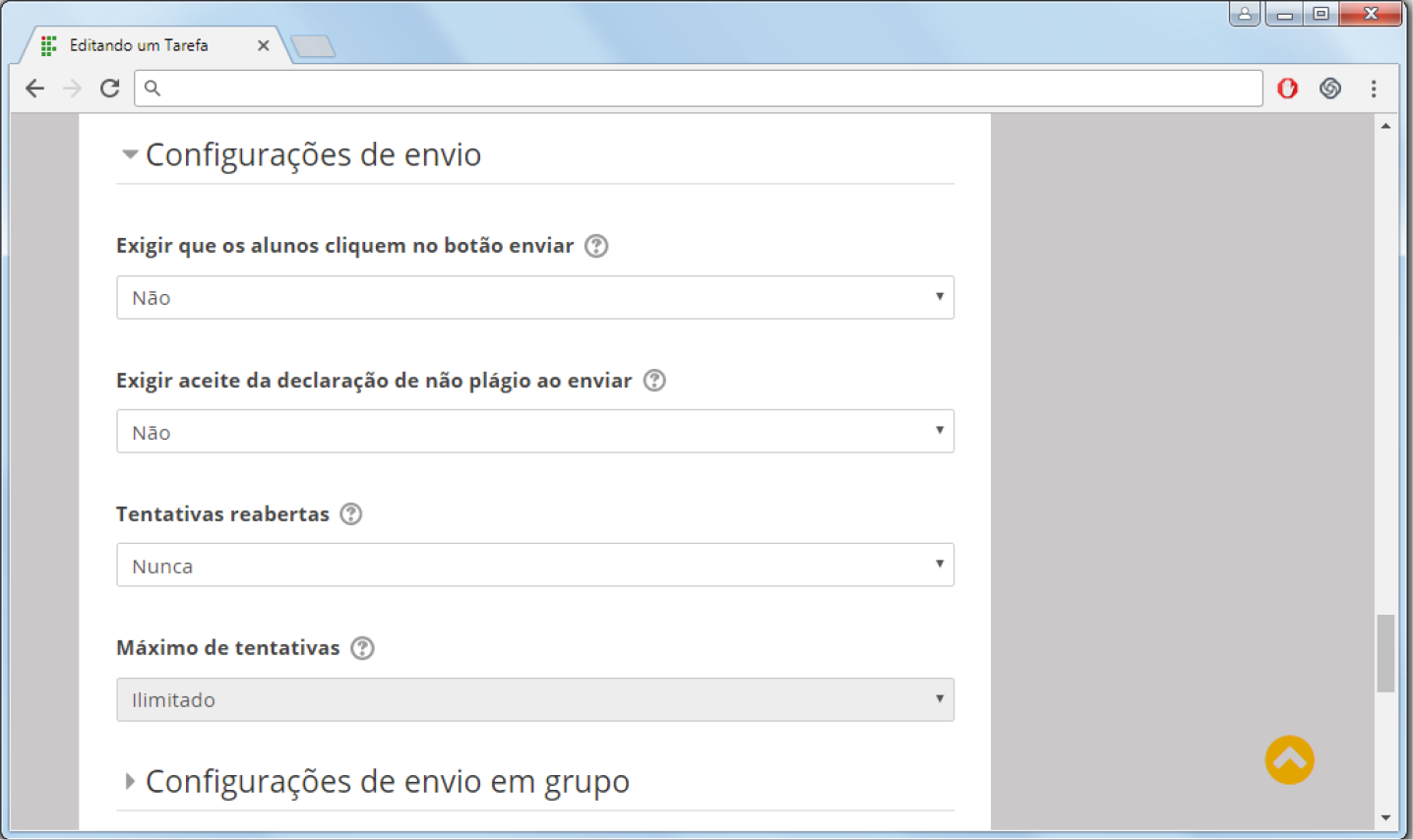 Na aba "Configurações de envio", pode-se escolher se o professor deseja que os os alunos tenham que clicar no botão enviar, aceitar declaração de não plágio, o número de tentativas reabertas (determina como as tentativas de envio do estudante são reabertas; as opções disponíveis são: a, nunca - O envio do estudante não pode ser reaberto; b, manualmente - O envio do estudante pode ser reaberto por um professor; c, automaticamente até passar - O envio do estudante é automaticamente reaberto até o estudante obter a nota para passar, este valor é definido no livro de notas para esta tarefa) e o máximo de tentativas permitidas (depois de esgotado este número de tentativas de envio do estudante não poderá ser reaberto).