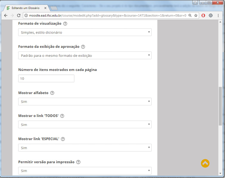 - Permitir versão para impressão: neste campo, você possibilita que o aluno visualize uma versão otimizada para impressão do glossário, escolhendo a opção Sim ou Não. O professor, sempre que desejar, pode ver essa modalidade de visualização para impressão.