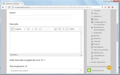 - Tipo de glossário: neste campo, você deve selecionar uma, entre duas opções, Glossário principal ou Glossário secundário. Cada curso pode ter apenas um Glossário Principal, sendo que nesta opção, somente os professores possuem permissão para atualizá-lo. Já na opção Glossário secundário todos os participantes do curso/disciplina possuem permissão para acrescentar termos ao Glossário.