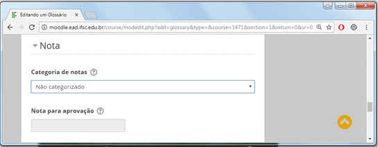 Na aba "Notas", escolha a categoria de notas: selecione a categoria de notas do livro de notas à qual esta atividade estará subordinada. Esta escolha tem impacto sobre a forma como as notas da atividade serão agregadas com as notas de outras atividades para compor a nota final do curso. Esta categoria pode ser alterada posteriormente, tanto aqui como diretamente no livro de notas. Abaixo, coloque a nota para aprovação: esta configuração determina a nota mínima para passar. O valor é usado na conclusão de atividades e do curso e no livro de notas, no qual ficam registradas da seguinte maneira: as notas que passaram são destacadas em verde e as que não falharam, em vermelho.
