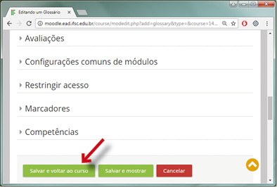 Caso necessário, você pode alterar configurações mais comuns de módulos, restringir acesso dos participantes, inserir marcadores e modificar configurações de competências. Para finalizar o processo, clique em "salvar e voltar ao curso" ou "salvar e mostrar", caso queira salvar as alterações. Para descartar as alterações, clique em "cancelar".