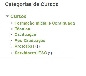 Estes cursos podem ser acessados na Página Inicial do Moodle, através das seguintes categorias de cursos:
