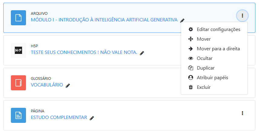 Quando o modo de edição está ativo, no lado direito de cada recurso, aparece um ícone com três pontinhos alinhados verticalmente. Ao clicar nesse ícone, são exibidas diversas opções, conforme a imagem a seguir: