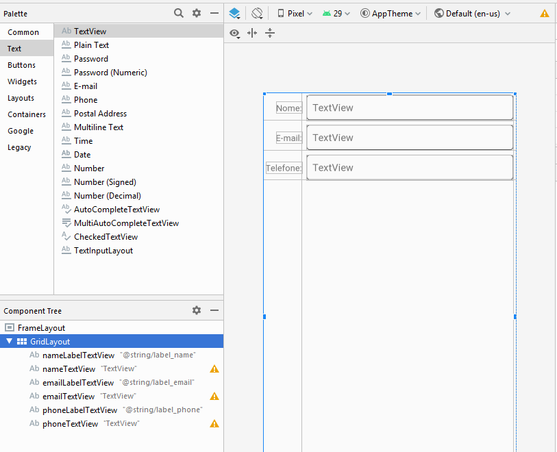Adicione ao GridLayout os elementos TextView organizados como na próxima figura:
