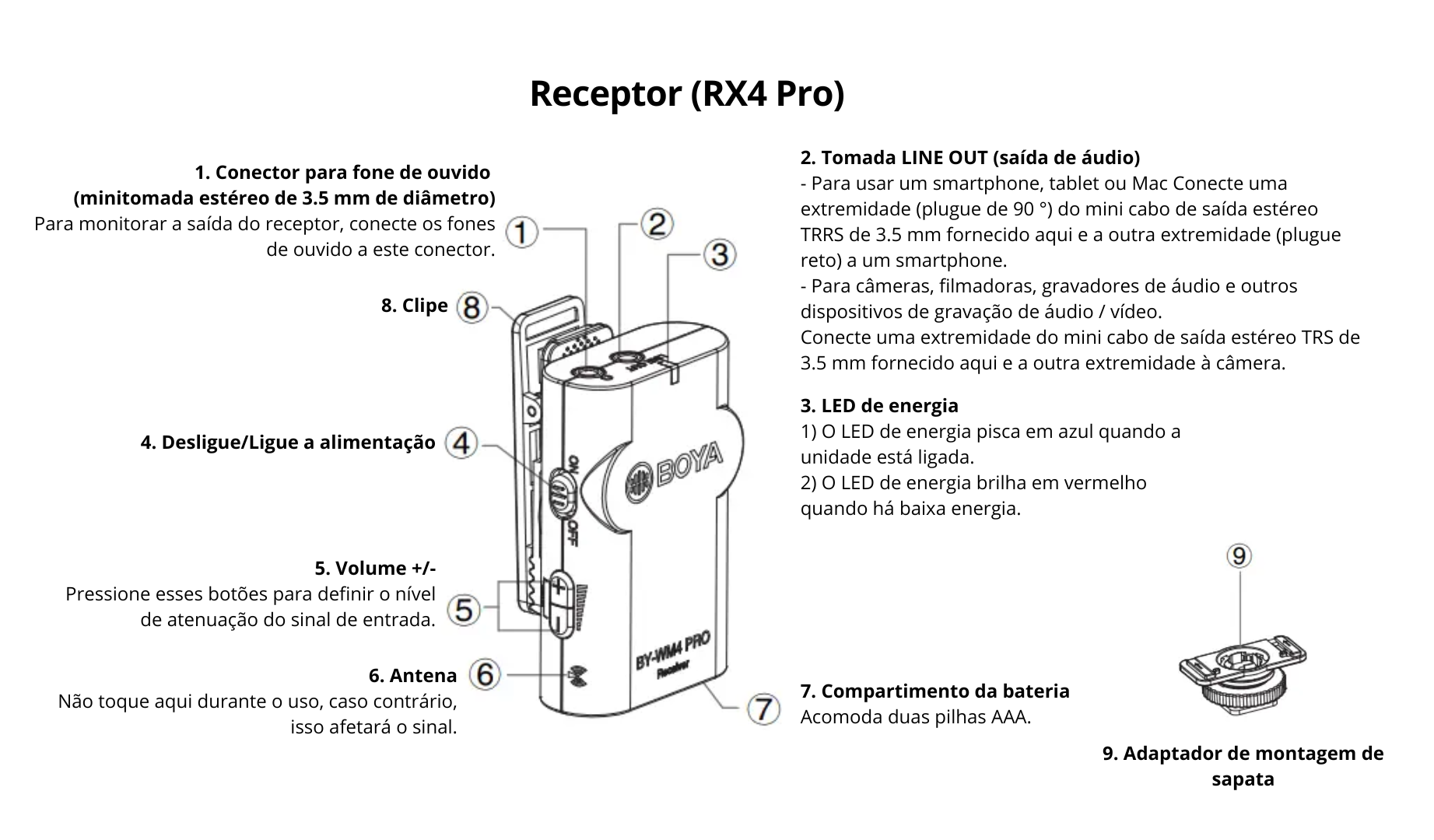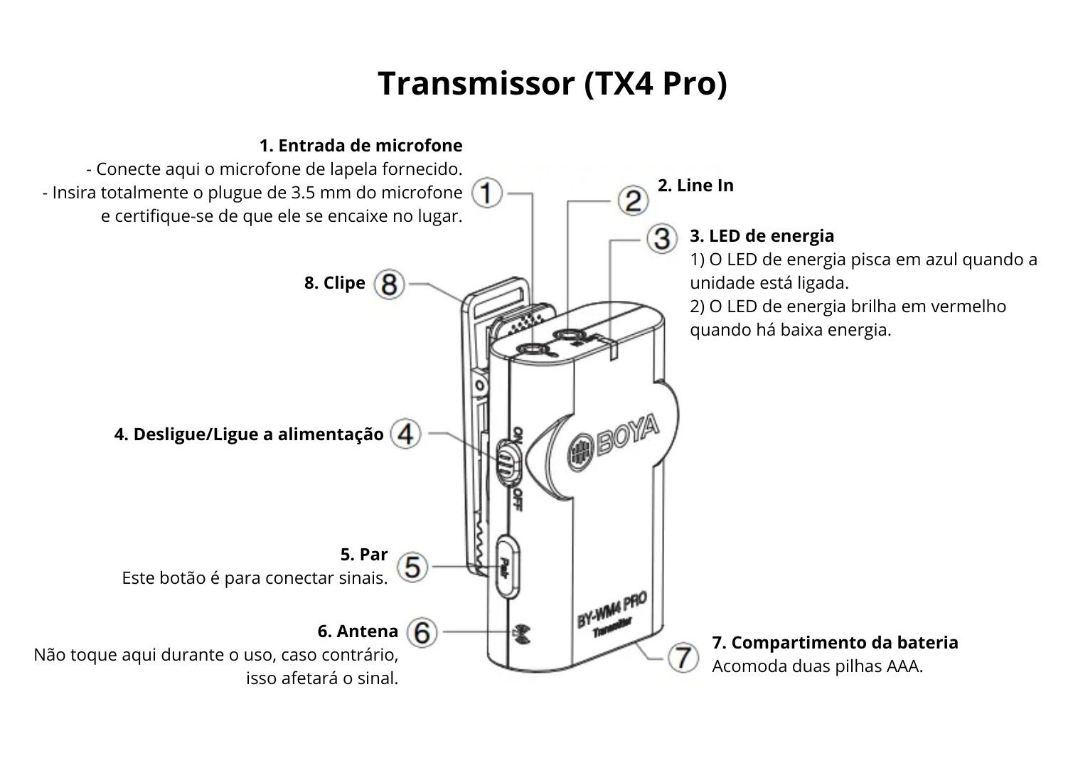 - Ideal para a gravação de vídeos, o BY-WM4 PRO da Boya se destaca por oferecer qualidade de áudio clara e confiável em um formato prático e acessível. Com sua tecnologia sem fio de 2.4 GHz, ele permite ao professor se movimentar livremente pela sala de aula ou estúdio enquanto realiza gravações ou transmissões ao vivo, sem a preocupação de cabos limitando seus movimentos.