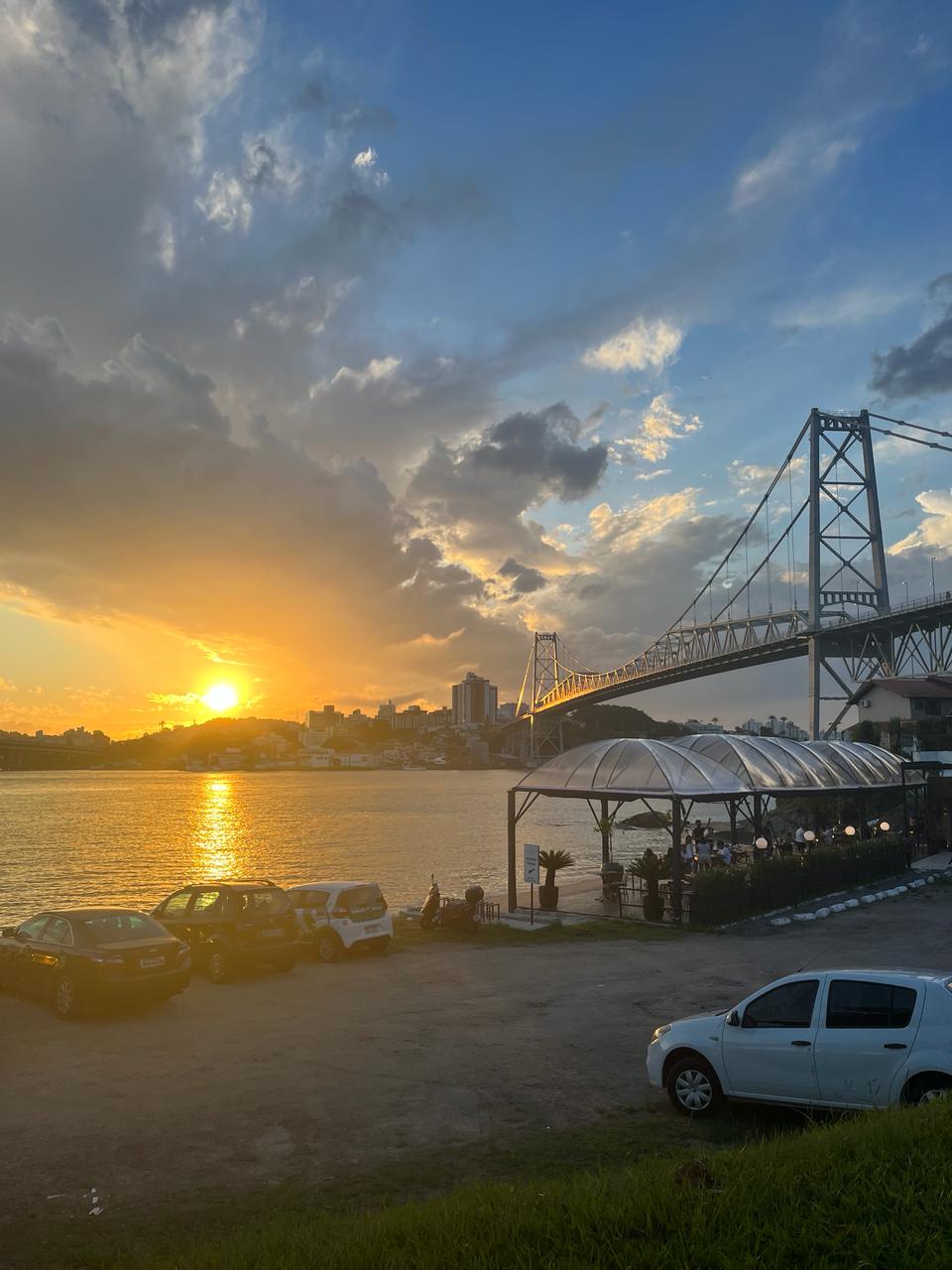 A imagem apresentada mostra um por do sol na ponta Hercílio Luz na cidade de Florianópolis - SC. O céu está azul com muitas nuvens brancas acinzentadas. Em plano de fundo temos alguns morros e prédios que se estendem por todo o fundo da foto, ao fundo no lado esquerdo temos o sol que está refletindo na agua, e do lado direito a ponte Hercílio Luz. Logo abaixo ao centro da imagem observa-se o mar calmo. Por fim em primeiro plano temos um estacionamento com alguns carros estacionados e um restaurante.