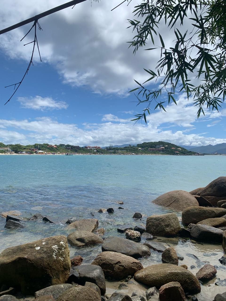 A foto foi feita na Praia da Pinheira- SC. Na parte de cima, é possível ver um céu azul com poucas nuvens, e alguns galhos de árvore. Ao fundo, pode- se observar uma grande área verde, com algumas casas no meio. Abaixo, observa-se um mar calmo, com algumas pedras na beira da água.